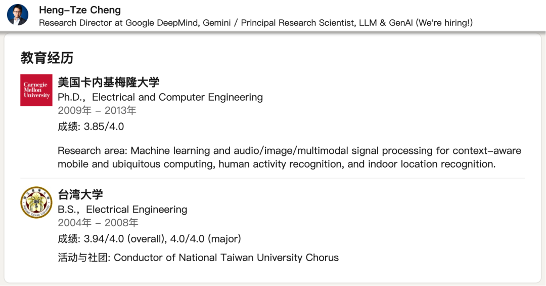 Heng-Tze Cheng 是 Google DeepMind 的研究总监兼首席研究科学家,专注于大语言模型和对话 AI 的研究与应用。他在自然语言处理(NLP)、推荐系统、强化学习和多模态推理等领域具有深厚的研究背景。
