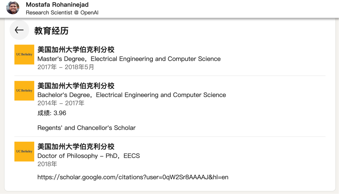 在加入 OpenAI 之前,Mostafa 曾在加州大学伯克利分校攻读计算机科学硕士学位,并在该校的 BAIR 实验室与 Pieter Abbeel 教授合作,研究元学习和生成模型。他是著名的 SNAIL 架构的共同作者,该架构在少样本学习任务中表现出色。