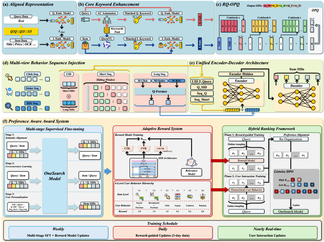 用于搜索的生成式模型,需要同时准确把握〈query, item〉对的相关性以及用户的个性化偏好。OneSearch 创新性地设计了三阶段 SFT 训练任务:分别实现语义内容对齐、协同信息对齐、用户个性化建模。这就类似于 “上课” 的过程,从易到难,进行课程学习。