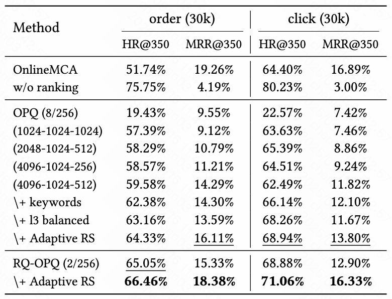 基于线上真实用户行为日志构建的离线测试集表明,OneSearch 提出的 RQ-OPQ 编码与自适应奖励系统相结合的方法效果最优,相比现有级联式系统(OnlineMCA),各项指标均有显著提升。