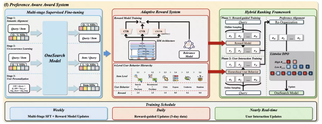 相比于推荐系统中的序列一致性,搜索中 query 和 item 之间的强相关性约束对生成式模型提出了更大的挑战。对于 GR 模型,不仅需要实现 SID 与 query/item 之间的语义对齐,还需要根据序列信息直接生成满足相关性约束和用户偏好的 item。因此,OneSearch 提出了一个偏好感知奖励系统,包括多阶段监督微调(SFT)和自适应奖励系统,以增强模型的个性化排序能力。