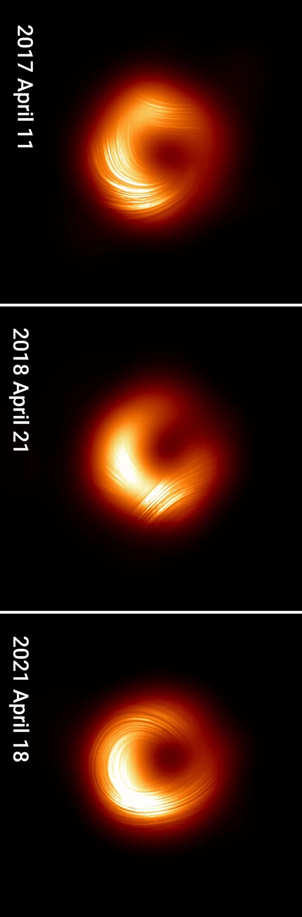 黑洞的大小和“阴影”也没有明显变化,这正好验证了爱因斯坦广义相对论的预测。