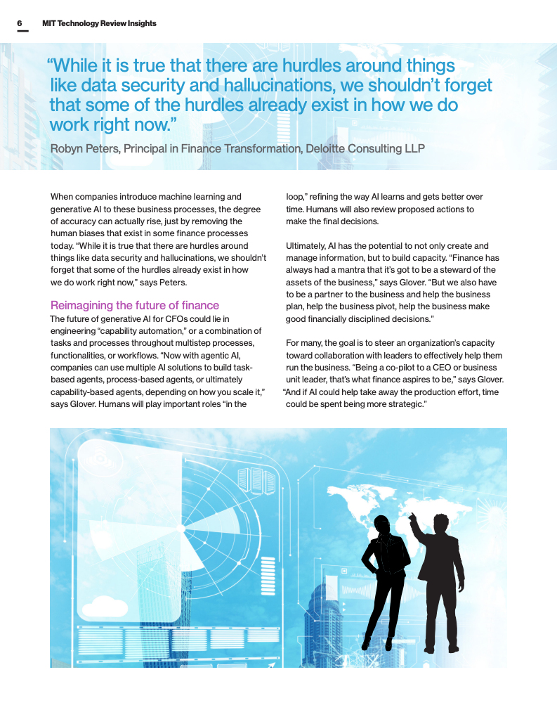 生成式AI真正释放潜力需要财务与业务的深度融合。如德勤高级咨询顾问指出,AI可为财务专业人士提供约80%的工作初稿支持,辅助预算编制、业绩预测和数据分析,从而降低人为偏见和错误。未来的财务职能不仅要成为企业资产的守护者,更需成为战略合伙人,助力企业灵活应对市场波动和地缘政治不确定性。AI将扮演助理角色,协同人类决策者优化流程,提升整体企业应变能力。