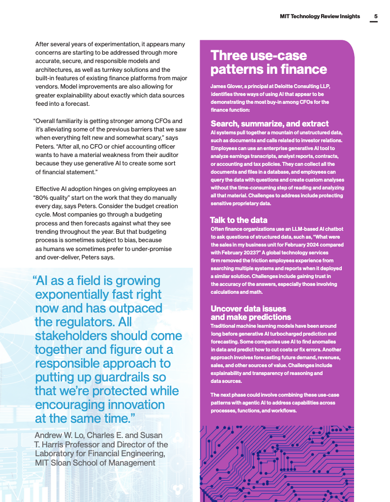 财务部门利用AI改善数据整合和分析能力日益明显。AI系统能够跨多个信息源自动汇集数据,为决策层提供清晰的“单一信息视窗”,大幅简化财务人员在多系统间切换和数据搜寻的繁琐流程。具体应用涵盖了现金流预测、收入和流动性管理、合同自动化以及投资分析等领域。尽管当前生成式AI在数学精度和复杂预测方面存在局限性,但技术的不断迭代正推动模型解释性和合规性保障向更高标准迈进。