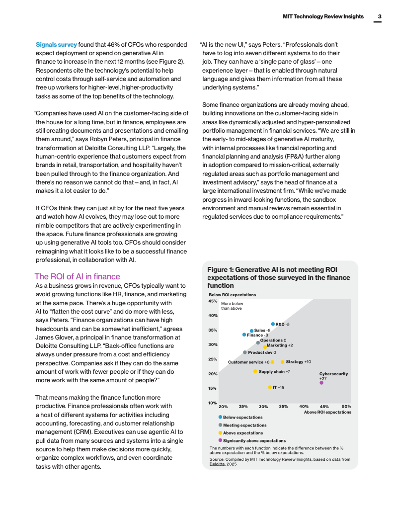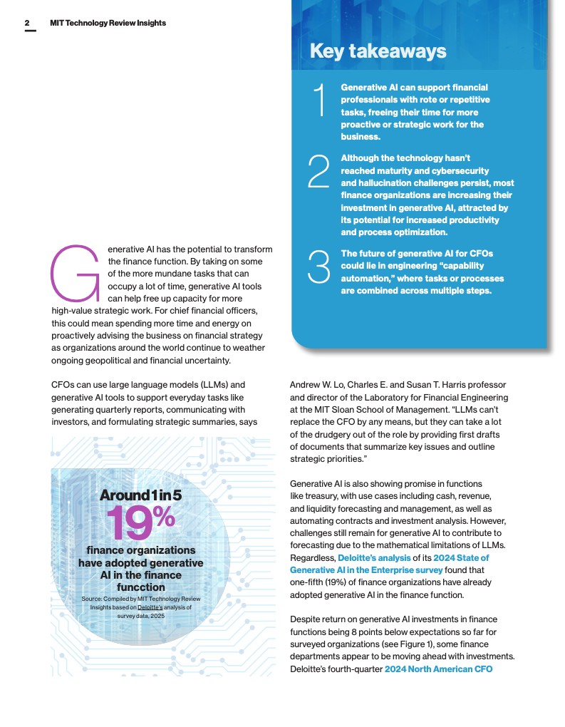 随着生成式人工智能(AI)技术的迅猛发展,财务职能正经历一场深刻的变革。根据德勤和麻省理工科技评论的调研,约有19%的财务组织已开始采用生成式AI,尽管其投资回报率(ROI)尚未完全达到预期,但近一半的首席财务官(CFO)预计未来一年内在财务领域的AI部署及支出将继续增长。生成式AI主要助力财务人员处理重复性、机械化任务,例如季度报告的起草、投资者沟通及战略摘要的形成,这使得财务专业人士能集中精力于更高价值的战略工作,从而提升整体组织的生产力和决策速度。