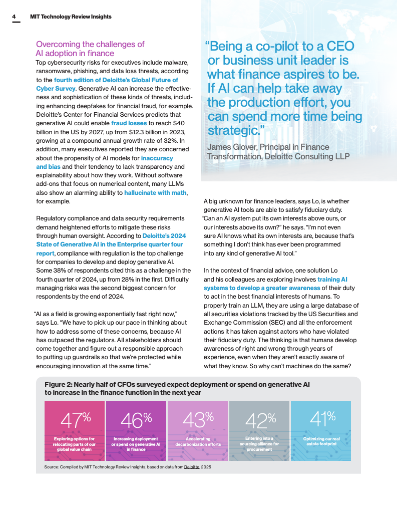 然而,生成式AI在财务部门的应用仍面临多重挑战。网络安全威胁加剧,尤其是AI驱动的诈骗和深度伪造呈指数级增长。德勤预测,到2027年,美国因生成式AI导致的欺诈损失将增长至400亿美元,年复合增长率达32%。此外,模型的偏见、不透明性和可能的“幻觉”风险也对合规管理构成严峻考验。目前,约38%的受访企业认为合规性是采用生成式AI的最大障碍,越来越多的监管机构正加紧制定规则与标准。专家呼吁产业界、监管层和学术界共同制定负责任的应用规范,既保障风险控制也推动创新发展。