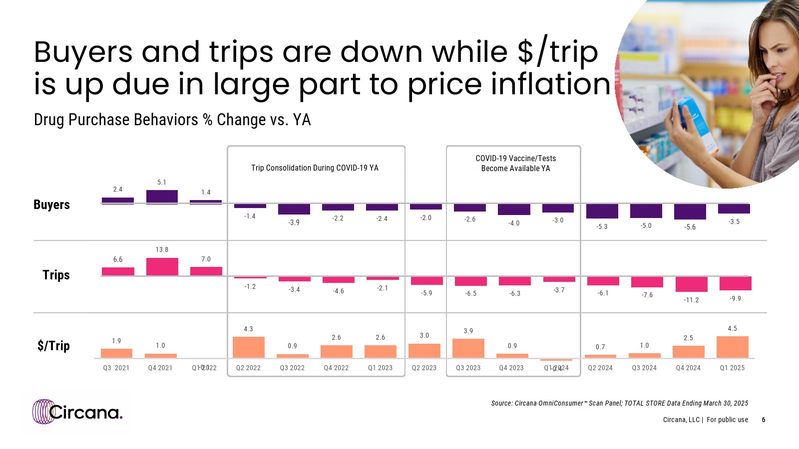 药品渠道的购买者数量在2025年第一季度的降幅较2024年第四季度有所收窄,但仍呈下降趋势,因为消费者继续更多地选择其他渠道购物。
