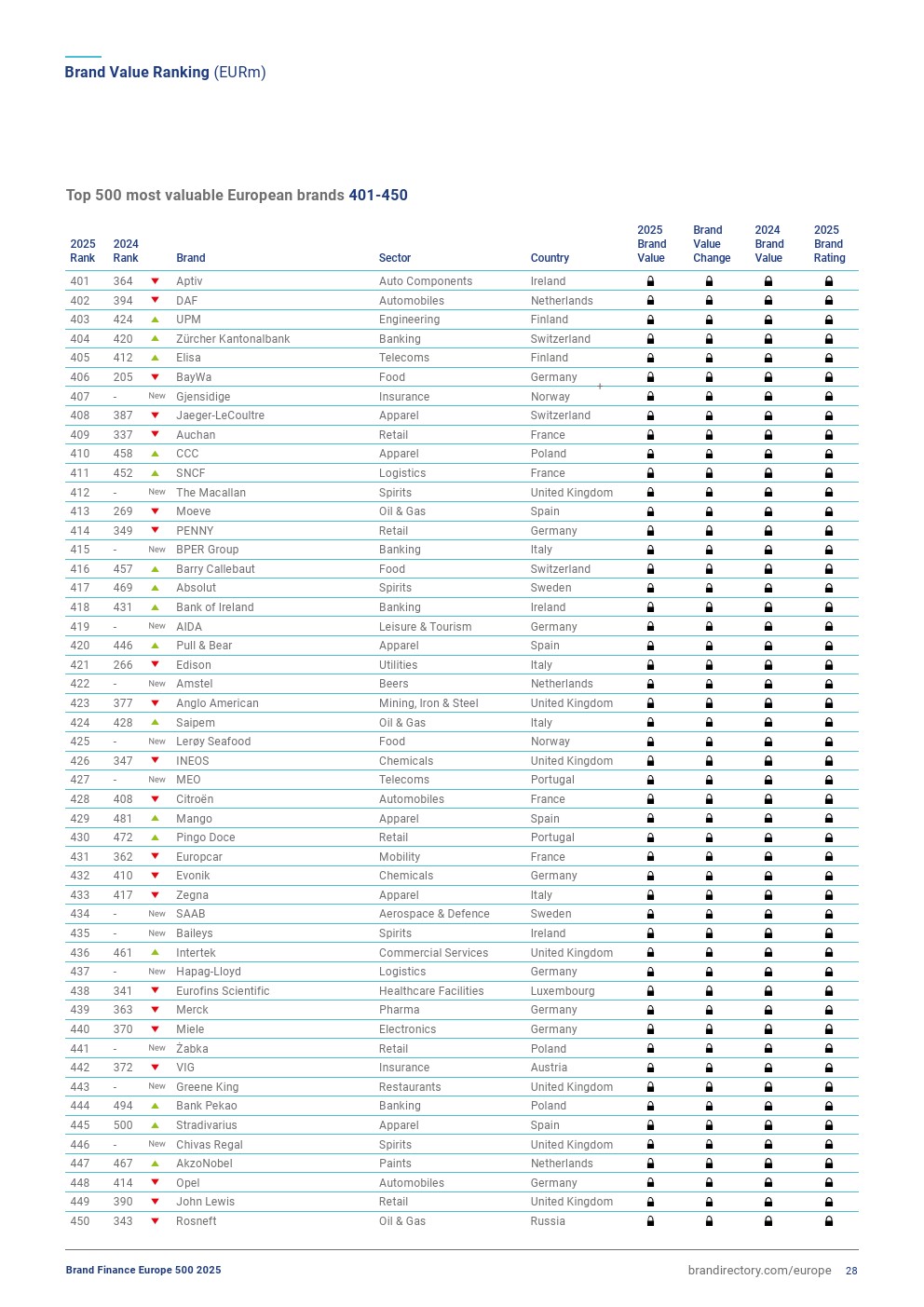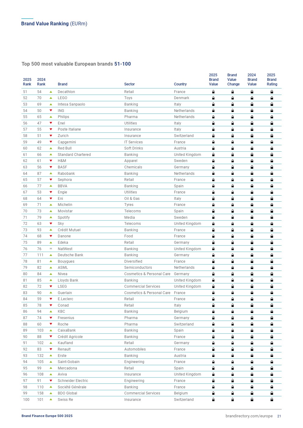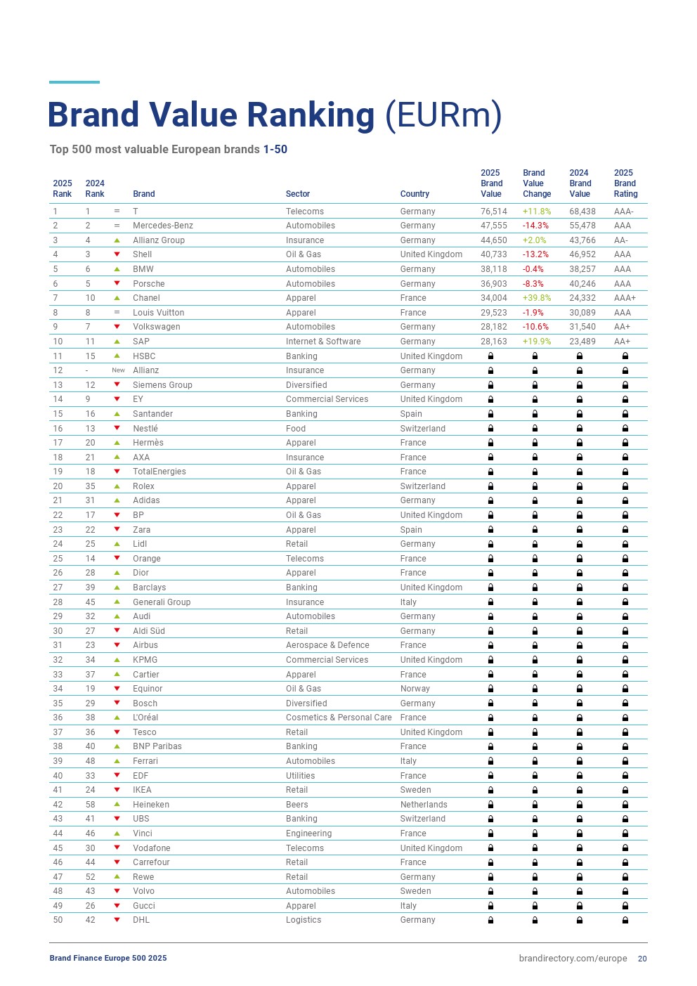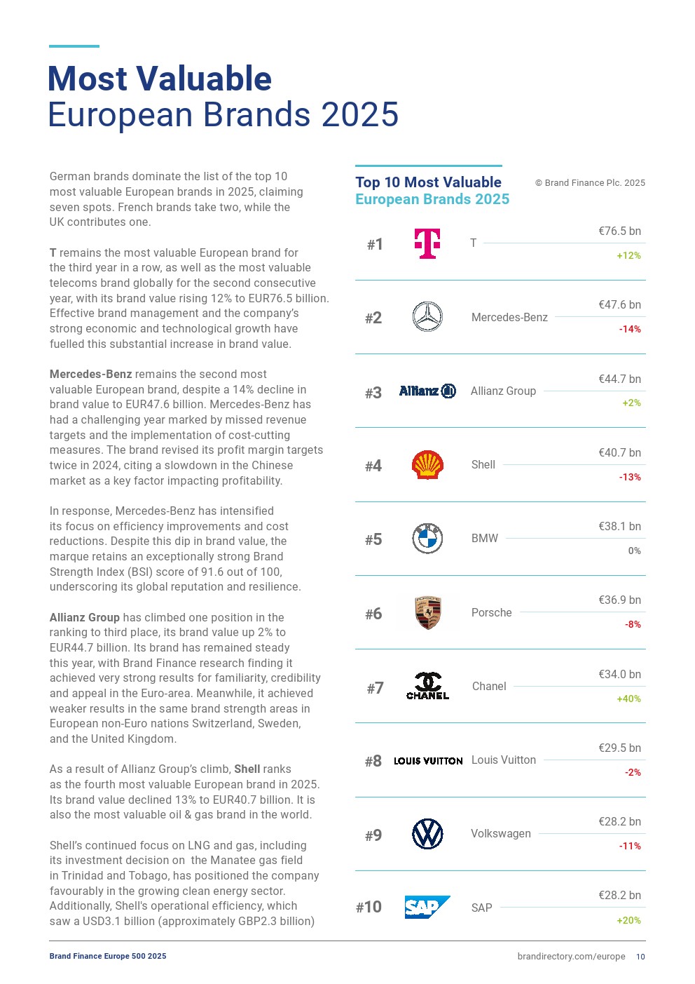 安联集团排名上升一位,排在第三位,品牌价值增长2%,达到447亿欧元。今年,该品牌表现稳定,其在欧元区的品牌认知度、可信度和吸引力方面表现非常强劲。