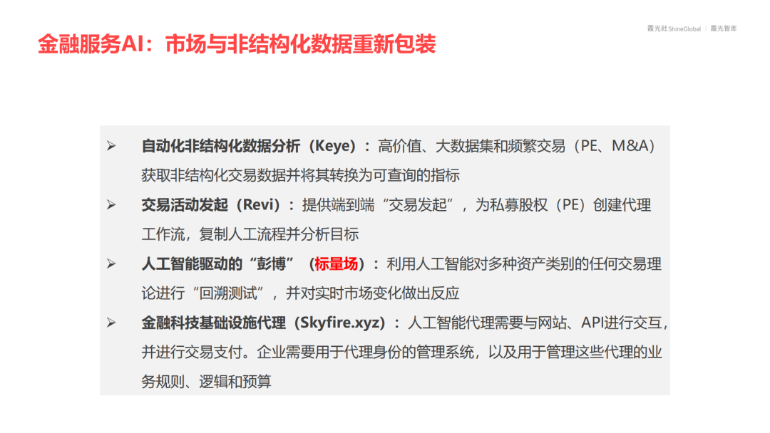 在高价值、高频交易场景中,AI通过自动化非结构化数据分析、交易发起和策略回测,可显著提升决策速度和精准度。未来,AI将成为金融机构的核心生产力工具,尤其是在另类投资与跨市场交易中。