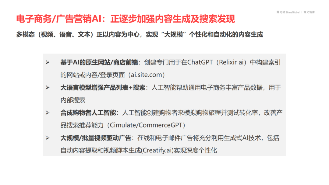 AI正在重构电商和广告营销,从搜索驱动转向生成驱动。通过AI原生网站、AI购物者模拟等技术,不仅能提升转化率,还能实现广告内容的超个性化投放。未来,具备AI原生营销能力的平台将直接左右流量分配和市场竞争格局。