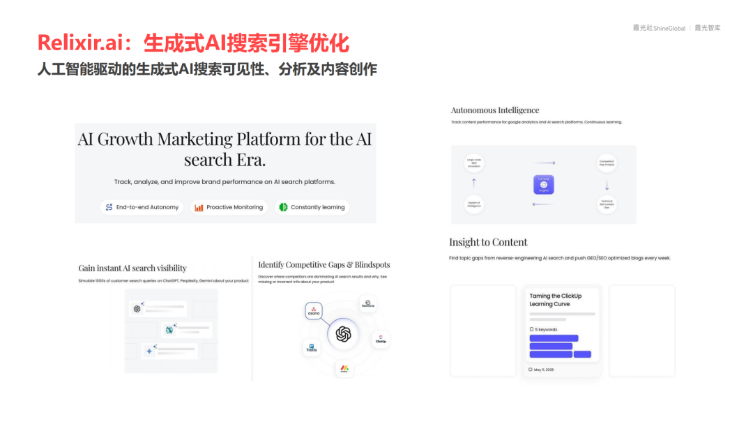 Relixir.ai通过生成式AI进行搜索引擎优化,将内容生成与流量转化深度绑定。这种技术路径在电商、媒体和广告行业的价值凸显,因为它能同时降低获客成本并提升内容相关性,从而形成营销转化的正向循环。