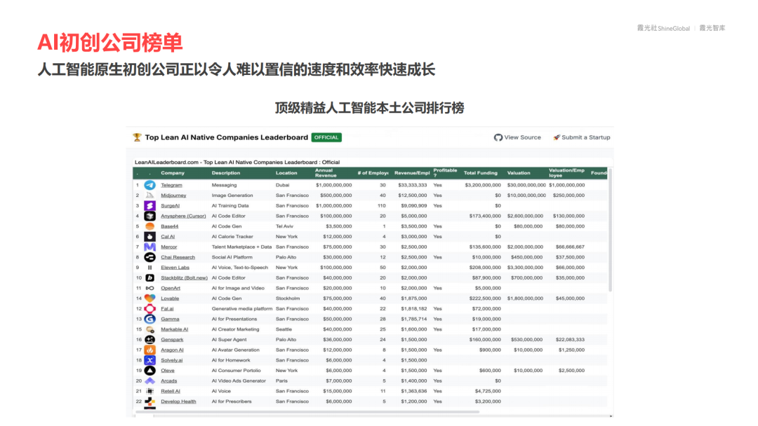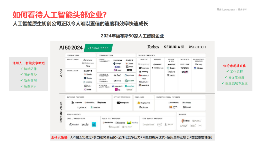 新一代AI初创公司正在通过“用户界面黏性+流程整合+专业知识+垂直细分”的策略,在行业纵深中构建护城河。模型同质化和算力商品化导致用户粘性弱、价格战加剧,全球竞争者涌现,向量数据库等基础设施快速迭代。因此,唯有数据与垂直能力相互加持,才能构建长期护城河。AI使用量虽激增,但盈利模式与差异化尚未稳定,企业仍面临高频演化下的生存压力。