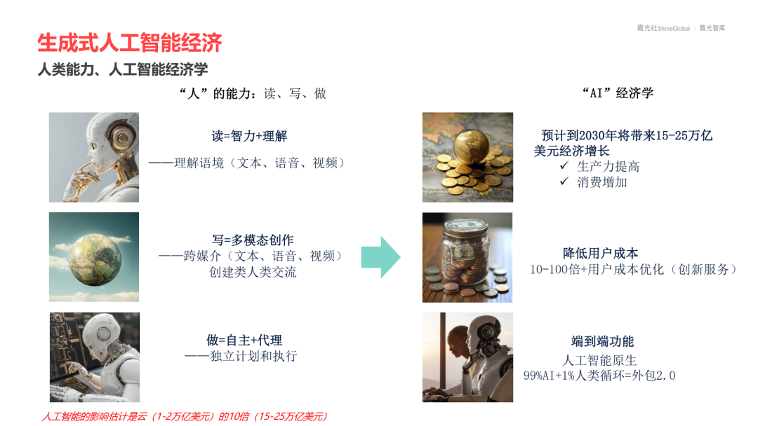 是否具备读(语境理解)、写(跨模态创作)、做(自主执行)等“人类性能水平”是判断AI效用的重要标准之一——以极低边际成本实现规模化智能服务。生成式AI不仅替代劳动,还能自我优化。预计到2030年,AI可贡献15–25万亿美元经济增量,远超云计算市场体量。核心价值主要来自生产力极大提升、市场教育普及以及成本有效控制。AI原生模式(99%AI+ 1%人类)有望颠覆内容生产行业。