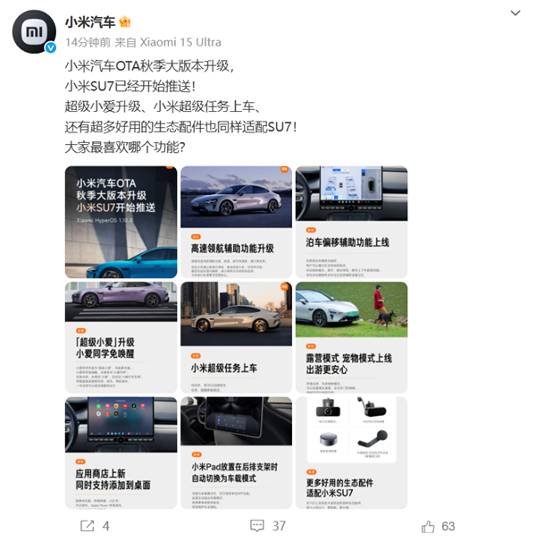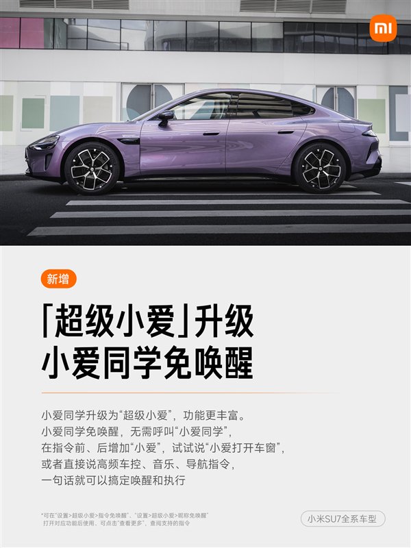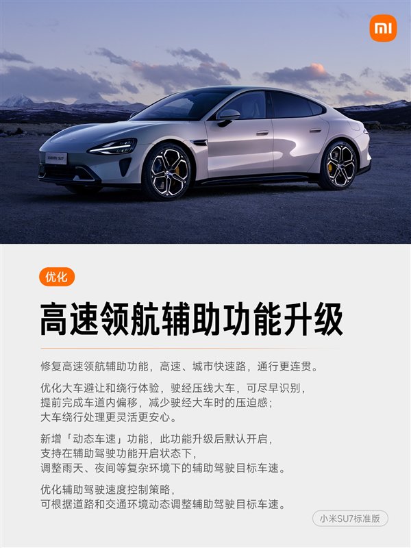 快科技9月19日消息,小米汽车宣布,小米汽车OTA秋季大版本升级已开始在小米SU7车上推送。