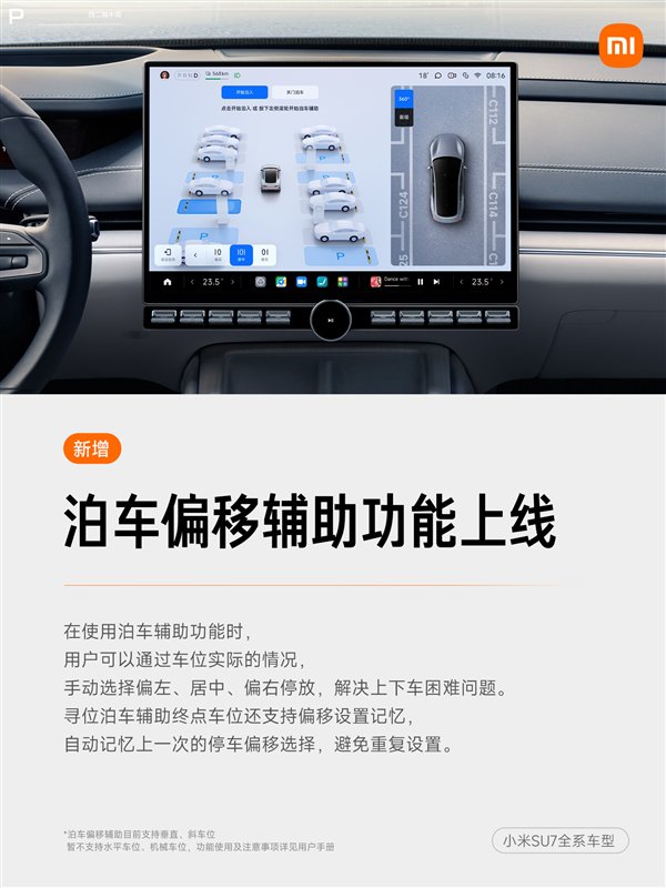 新增泊车偏移辅助功能,支持用户手动选择车位偏左、居中、偏右停放,解决上下车困难问题。
