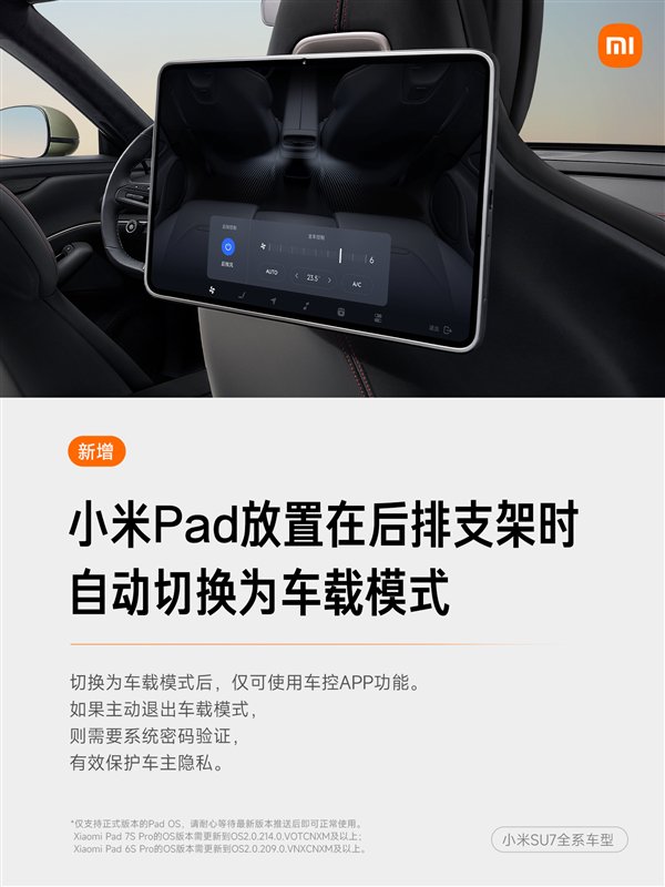 新增自动切换车载模式功能,小米Pad放置在后排支架时,自动切换为车载模式,切换为车载模式后,仅可使用车控APP功能。如果主动退出车载模式,则需要系统密码验证,有效保护车主隐私。