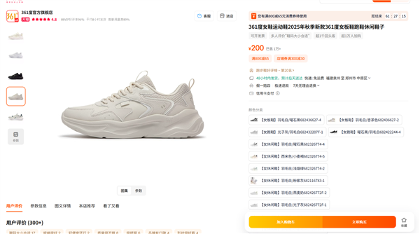 天猫361度官方旗舰店,361° 休闲鞋 / 运动鞋 / 板鞋等标价为200元,下单领取131元优惠券,