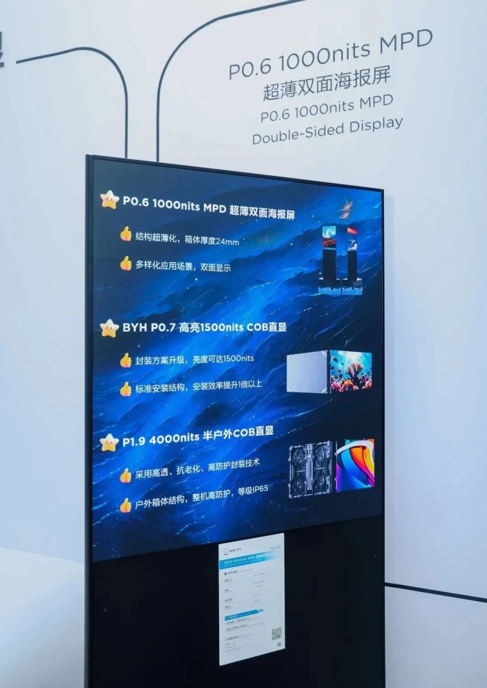 同时亮相的还有P0.6 MPD双面屏,该产品采用京东方华灿MPD先进封装技术打造P0.6微间距显示屏,提升视角色彩一致性,画质效果更佳,结构超薄化,亮度可达1000 nits,适用于户内大屏显示、数字展厅、高端会议等多样化场景。结合双屏内容联动,精准适配场景,实现专业显示与空间美学的深度融合,为消费者带来一场新奇的视觉体验。