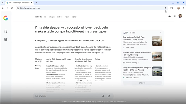 此外,Chrome的地址栏还将提供基于网页内容的情境搜索建议,例如当你浏览一个床垫网站时,多功能框可能会建议后续搜索问题,如“保修政策是什么?”