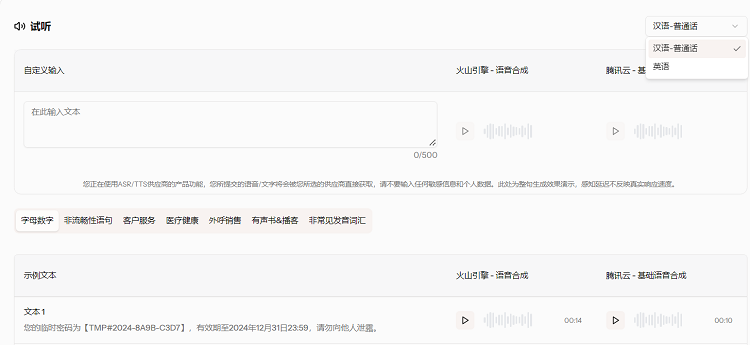 同时在 TTS 的对比中,在原先支持语音合成测试语句试听的基础上,新增了支持用户自主输入文本内容,一键生成语音合成效果的对比,并支持中英文。通过个性化试用场景,帮助用户快速验证技术与实际需求的匹配度,让选型决策更高效。