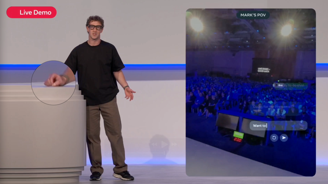 而今年的演示则更进一步,扎克伯格在现场甚至展示了一小段佩戴Display眼镜、通过腕带识别在桌面上手写字母的方式编辑和发送消息的过程。根据发布会的说法,腕带的手写识别速度至少在30wpm以上。