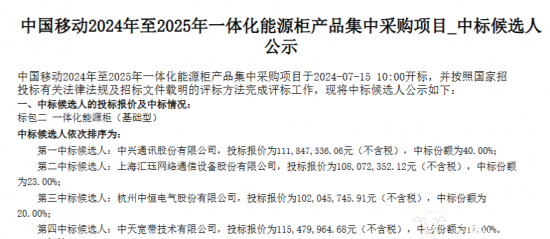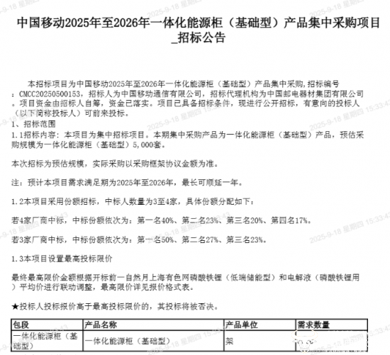 公开资料显示,2024年5月29日,中国移动曾开启“2024年至2025年一体化能源柜产品”的采购招标工作。采购内容为5000台一体化能源柜(智能型)和5000台一体化能源柜(基础型)。