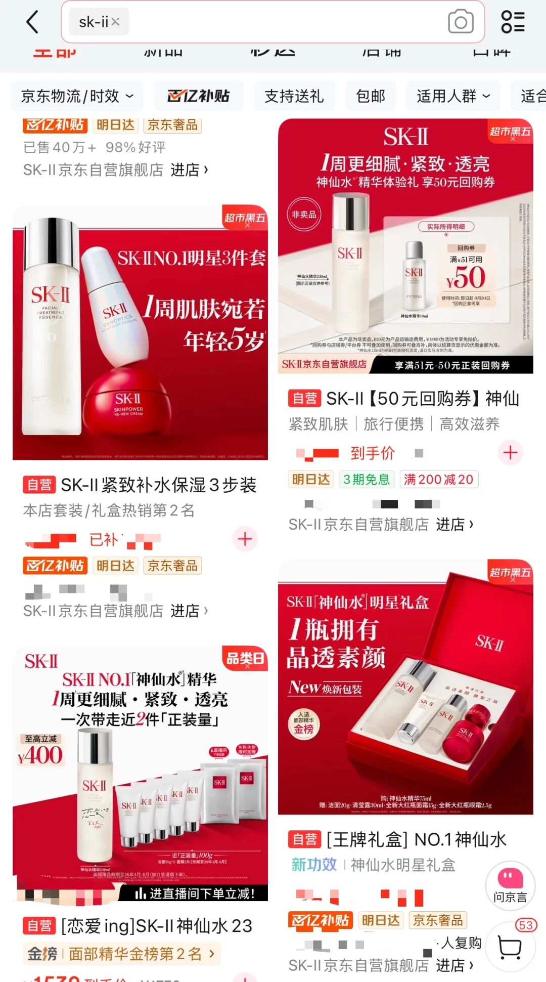 低退货率与高用户质量密切相关。如果你在京东APP搜索“SK-II”就会发现,排在前列的不只有明星产品“神仙水”,还有多款礼盒套装。“神仙水”与大红瓶面霜、清莹露、“小灯泡”精华等产品组合在一起,价格不菲却销量稳健。