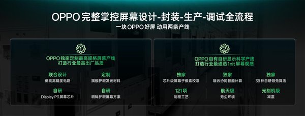 OPPO凭借在屏幕领域深厚的技术积累与超50亿资金的投入,独家定制最高规格旗舰屏幕产线,打造行业最高出厂品质的屏幕,配合OPPO自有的国内首条自研显示科学产线,打造自研屏幕双产线模式。