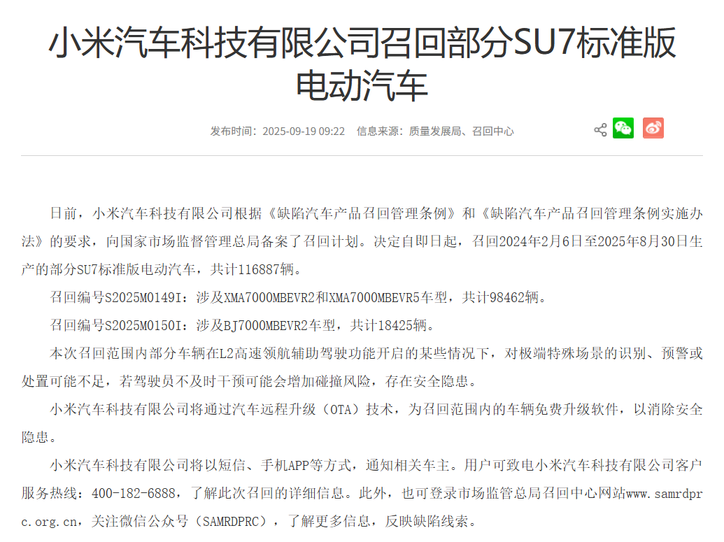 9月19日,小米汽车宣布对部分SU7标准版电动汽车实施召回,涉及车辆总数达116887辆,生产时间范围为2024年2月6日至2025年8月30日。