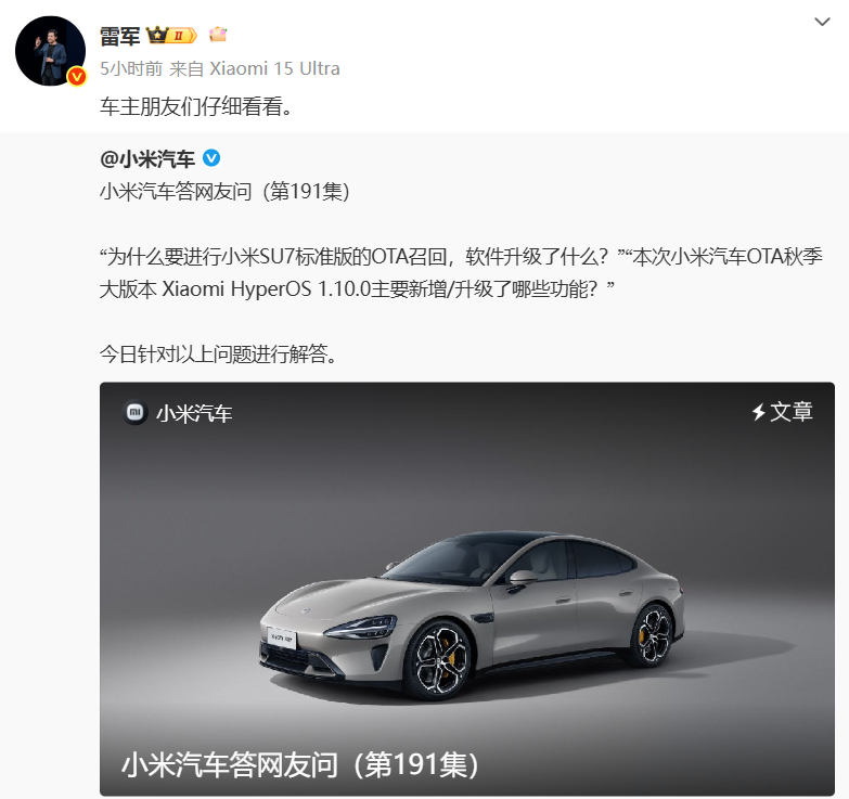 随后,小米汽车董事长雷军在微博上转发了《小米汽车答网友问(第191集)》,并呼吁车主关注详细说明。