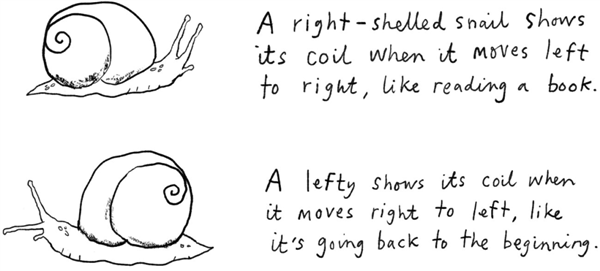 她看着这只蜗牛,总觉得它很怪,但又说不出哪里怪。拿手上端详了半天才意识到,蜗牛螺壳罕见地往左边卷曲,常见的蜗牛壳是往右的。