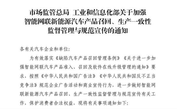 今年8月中旬,市场监管总局、工业和信息化部就专门起草了《市场监管总局 工业和信息化部关于加强智能网联新能源汽车产品召回 生产一致性监督管理与规范宣传的通知》的征求意见稿,征求意见截止日期是几天前的9月15号。