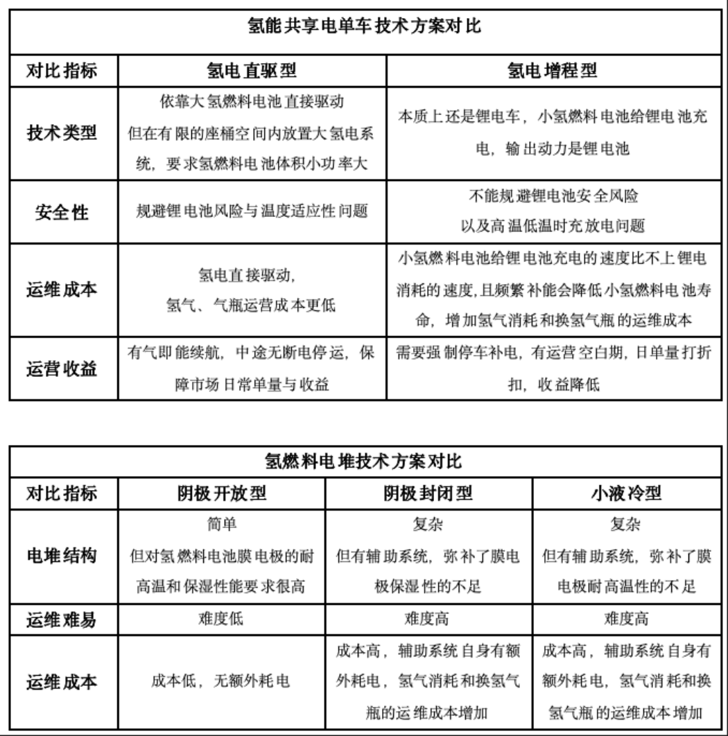 根据专家介绍,目前市面上已经投放的氢能共享电单车主要有氢电直驱型和氢电增程型两大技术方案,其中电堆又有阴极开放型、阴极封闭型、小液冷堆三个方案。