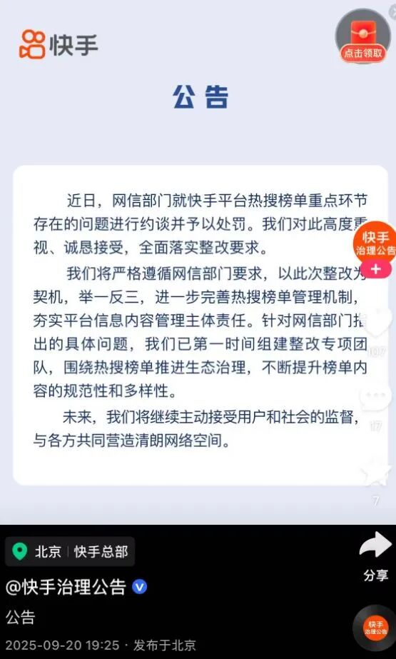 9月20日,快手发布公告:近日,网信部门就快手平台热搜榜单重点环节存在的问题进行约谈并予以处罚。快手平台对此高度重视、诚恳接受,全面落实整改要求。将严格遵循网信部门要求,以此次整改治理公告契机,举一反三,进一步完善热搜榜单管理机制,夯实平台信息内容管理主体责任。针对网信部门指出的具体问题,已第一时间组建整改专项团队,围绕热搜榜单推进生态治理,不断提升榜单内容的规范性和多样性。未来,公司将继续主动接受用户和社会的监督,与各方共同营造清朗网络空间。