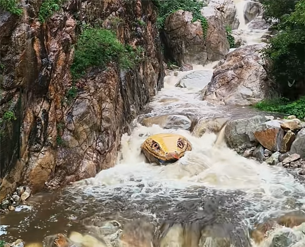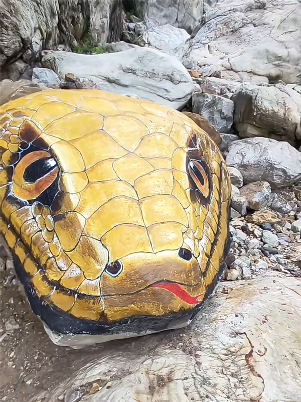 这块原本普通的石头,经彩绘后摇身一变,成为栩栩如生的巨型蛇头,盘踞在水中,给人带来强烈的视觉冲击。
