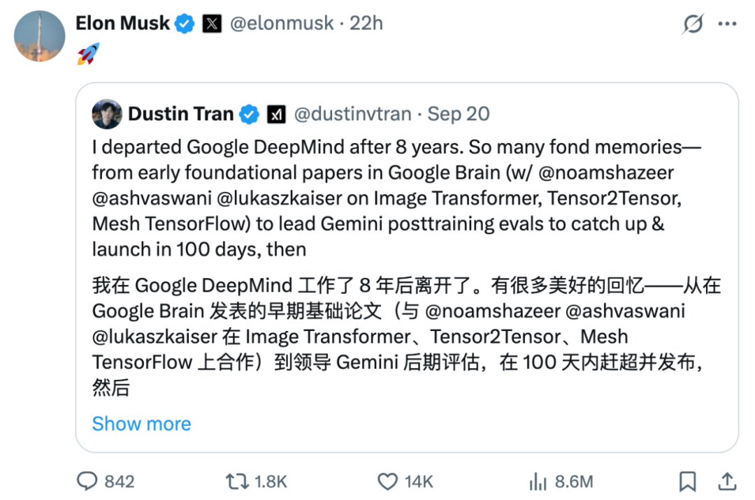 此次,被挖去 xAI 的是一名在谷歌 DeepMind 工作近 9 年的大神级人物 ——Dustin Tran,离职前担任资深首席研究员。