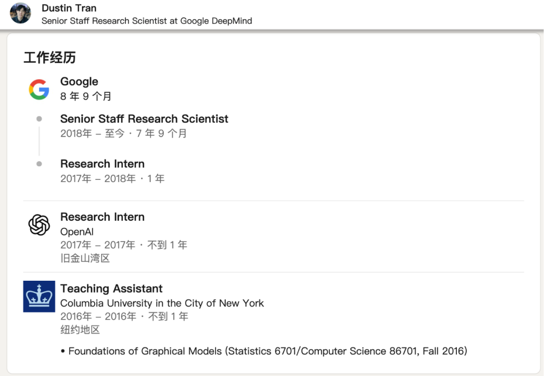 根据 Dustin Tran 的领英资料,他本科毕业于加州大学伯克利分校,此后原本在哈佛大学读统计学博士,但之后转到了哥伦比亚大学读计算机科学博士。