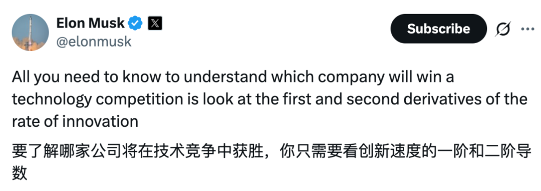 整个团队行动极其迅速,没有任何一家公司能够在如此短的时间内达到 xAI 今天在 AI 能力上的水平。正如马斯克所说,「一家公司创新速度的一阶与二阶导数最为重要:xAI 的加速度是最高的。」