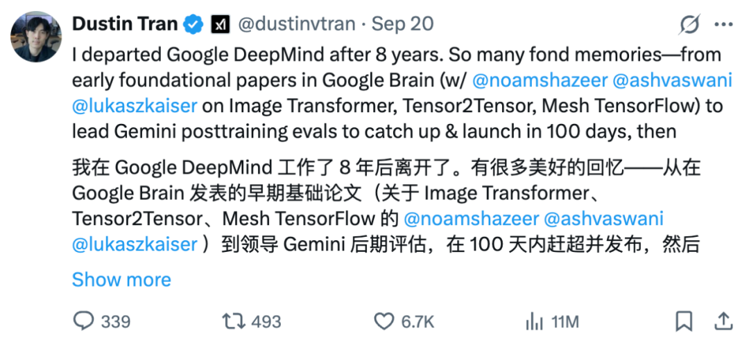 我在谷歌 DeepMind 工作 8 年多后选择了离开。这里留下了许多美好的回忆,最初在 Google Brain 参与早期奠基性的论文,与 Noam Shazeer、Ashish Vaswani、Lukasz Kaiser 合作完成 Image Transformer、Tensor2Tensor、Mesh TensorFlow。