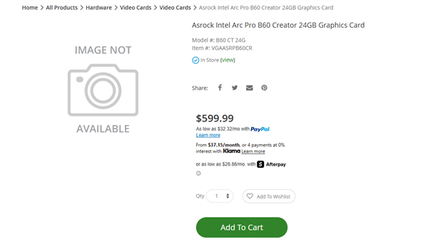 这款显卡目前不仅有货,而且可以立即发货,这表明锐炫Pro B60很快可能会出现在其他主要零售商的货架上。