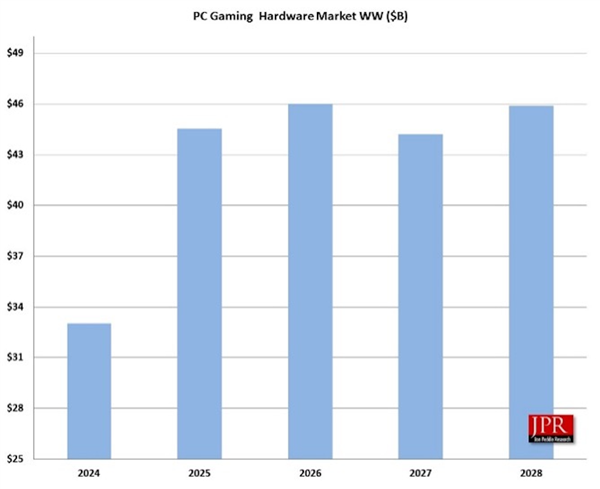 快科技9月21日消息,根据Jon Peddie Research最新报告,PC游戏硬件市场将在2025年迎来创纪录的35%增长,预计销售额将达到445亿美元,预计到2028年仍将保持400亿美元以上的市场规模。