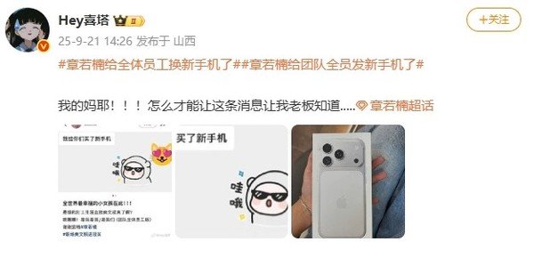 CNMO从网传图片获悉,章若楠为员工新换的手机正是时下火热的iPhone 17 Pro系列。