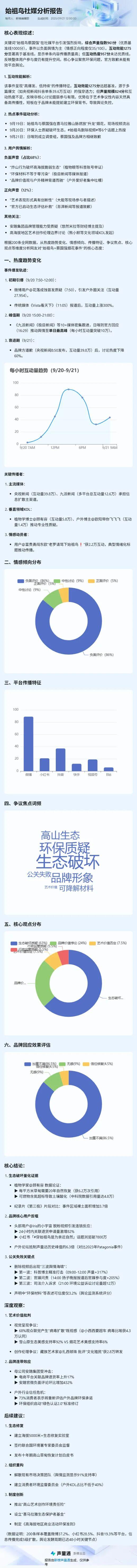 我们在声量通“社媒速查”板块输入关键词“始祖鸟”,筛选出9月19日-9月21日中午12点抖音、小红书、微博、公众号、视频号、快手、B站等各个平台上与之相关的爆款内容TOP200,让AI从热门内容、热门账号、平台分布、热度趋势等角度进行分析解读并生成内容、一键出图。