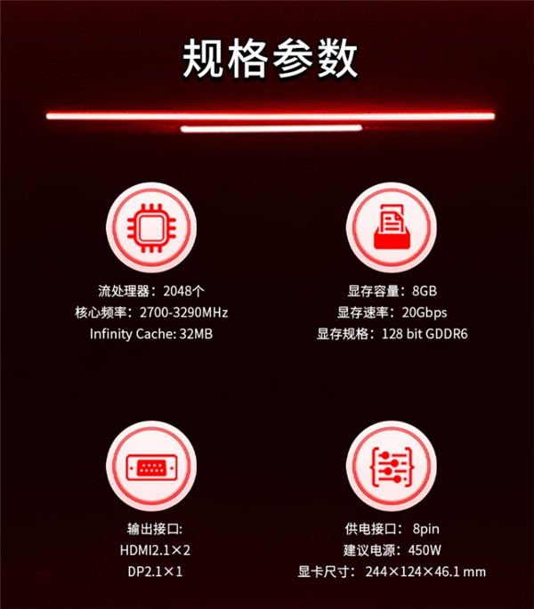这款显卡同样搭载AMD最新的RDNA 4架构,因此也支持AMD FSR4,采用4nm制程工艺,配备2048个流处理器,核心频率高达3290MHz,显存方面则采用8GB GDDR6规格,搭配128-bit位宽,足以应对2K分辨率下的主流游戏。