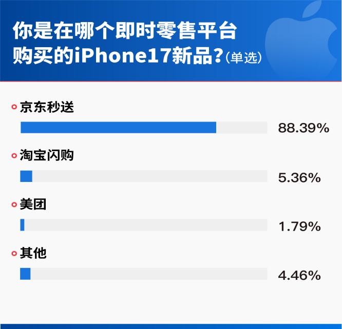 在即时零售赛道,京东表现同样突出。虽目前即时零售在iPhone 17销售中渗透率待提升,仅6.09%用户通过该渠道购机,但88.39%选即时零售的用户优先选京东秒送。这既展现京东即时零售运营实力,也反映用户的消费心智:想最快拿新机,第一时间想到京东秒送。