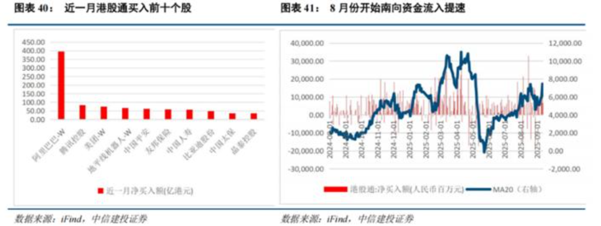 中信建投证券的统计发现,从8月份开始,南向资金流入港股的速度明显加快。近一个月港股通买入前十的股票,阿里巴巴、腾讯控股这些港股科技巨头,都是资金重点加仓的对象。