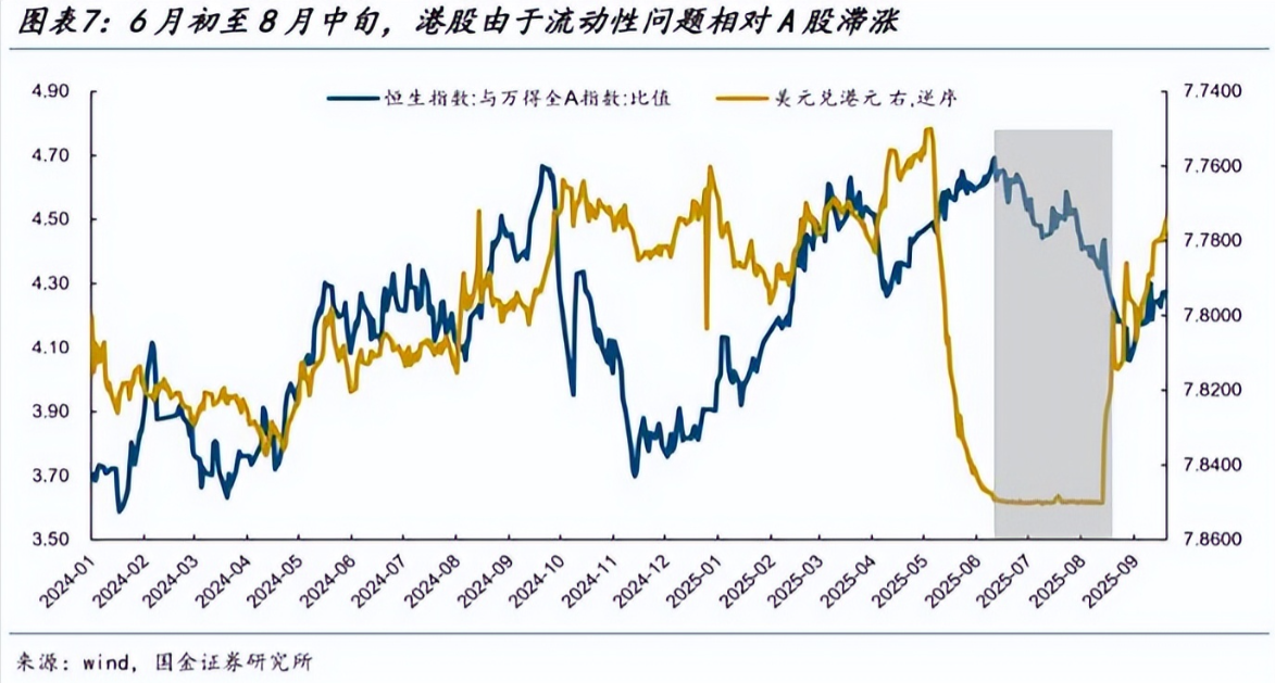 另一方面,自今年6月初至8月中旬,由于港元兑美元长时间触发弱方兑换保证,香港金管局通过买入港币卖出美元,在维持港币汇率稳定,而这一操作也对港股市场流动性形成了压制。