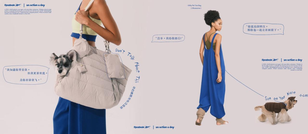 实际上,为了这次“关系的深化”,AAAD花了很久寻找合适的合作伙伴。最终选择Reebok 宠物用品品牌,不仅因为其运动基因,更是因为他们在功能上对细节的注重。比如,为公狗缩短衣服下摆5cm、六次打版只为贴合奔跑的动作。