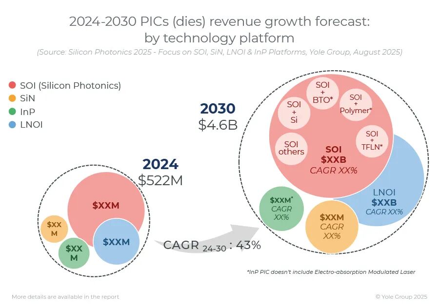 近日,市场研究机构YOLE Group表示,硅光子技术推动网络带宽不断突破,助力AI网络规模化扩展。其市场规模将从2024年的2.78亿美元激增至2030年的27亿美元,预计实现46%的复合年增长率。