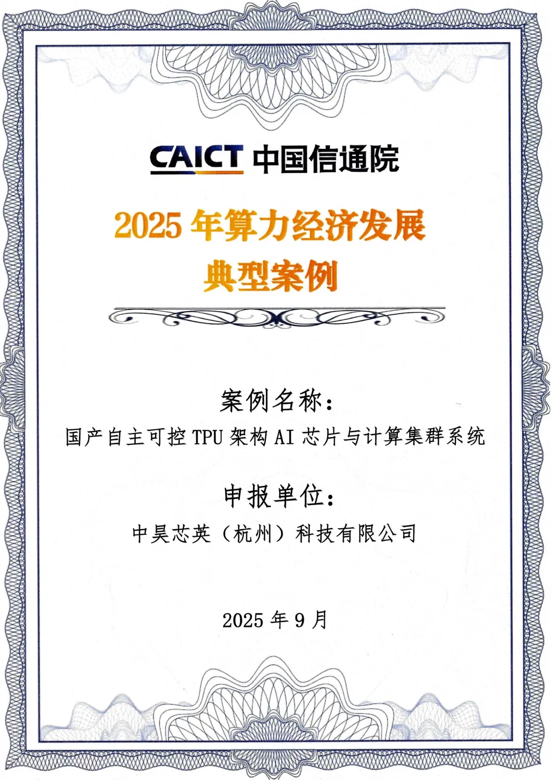 本次信通院“2025 年算力经济发展典型案例”征集工作旨在推动我国算力经济高质量发展,发挥算力经济推动我国经济增长的引擎作用,聚焦算力产业链结构优化升级,挖掘链上企业在技术突破、产品创新、服务改进等方面的创新举措,总结具有示范意义和推广价值的算力产业链发展经验。中昊芯英与北京金山云、浪潮通信、中国移动、杭州杭钢云计算数据中心、宁波中科信息技术应用研究院等科技企业及科研机构一起入选该案例。